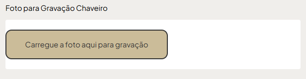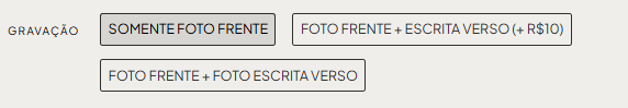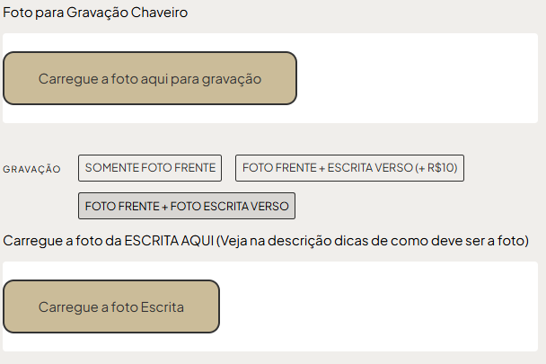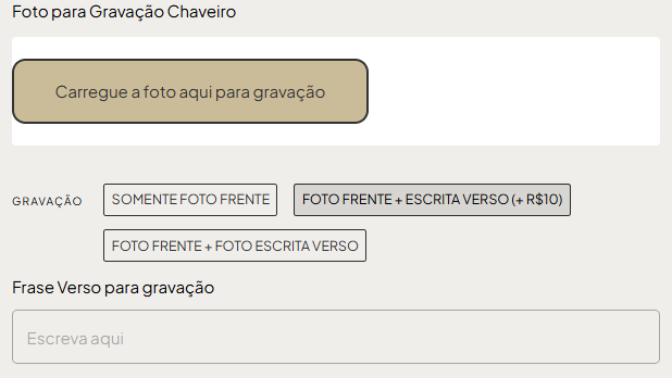 Se escolher Somente Foto Frente + Escrita Verso, irá ter 1 botão "Carregue a foto aqui para gravação" e um campo para escrever a frase (mensagem, nomes, simbolos).