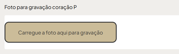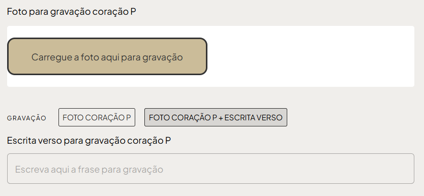 Se escolher Foto Coração P + Escrita Verso: Clique no balão "Carregue a foto aqui" e escolha a foto que deseja gravar e também preencha o campo: "Escreva aqui a frase para a gravação" com a sua frase.